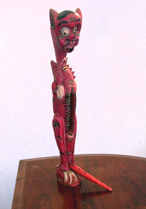 Die hier gezeigte Schlitztrommel aus Bali ist ein Aufschlagidiophon bestehend aus dem Abschnitt eines Baumstammes, der in der Mitte durch einen Längsschlitz ausgehöhlt ist. Er ist bemalt in Gestalt eines Fabelwesens, einem Drachen ähnlich. Die Tonhöhe der Schlitztrommel ist abhängig von der Wandstärke, der als Anschlagstelle dienenden Schlitzränder und der Größe des Resonanzraumes. Der Anschlag erfolgt mittels eines hier originalen Holzschlegels aus Hartholz.