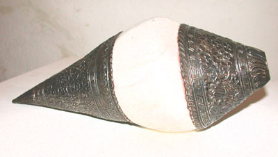 Die hier ausgestellte Schneckentrompete aus Tibet, ?Dung Kar? genannt, stellt nun eine Ausnahme zu den bisherigen Vorstellungen von Trompeten dar. An Stelle einer Röhre wird hier ein Schneckengehäuse verwendet. Unter- und Oberende sind mit schönem, reliefdekoriertem Silberblech verkleidet. Im Oberende befindet sich das trichterförmige Mundloch. Diese Trompeten wurden in den Klöstern verwendet. Im Freien wurden sie paarweise zu kultischen Zwecken nach den vier Himmelsrichtungen geblasen.