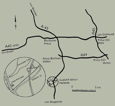 A43, Abfahrt Witten-Herbede, Wittener Str. rechts, An der Kemnade rechts.